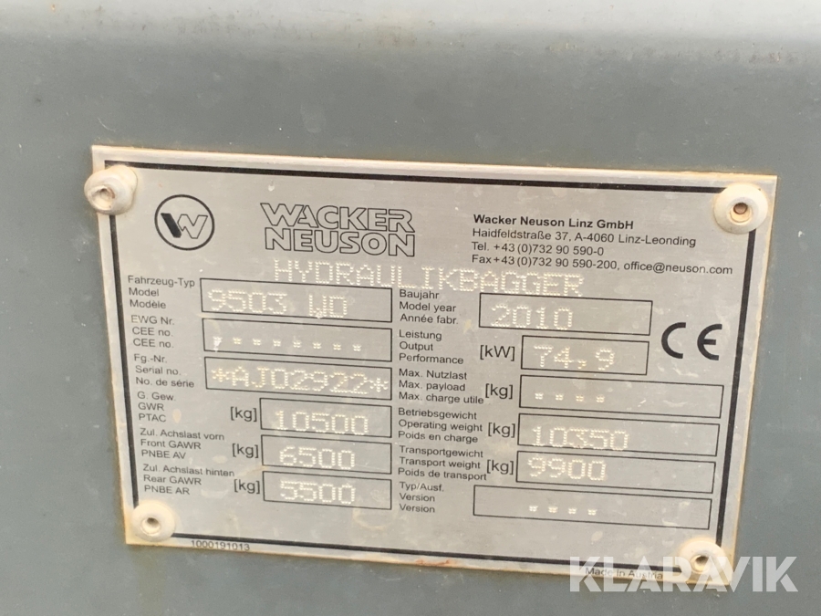 Grävmaskin Wacker Neuson 9503 WD med tiltrotator och skopor