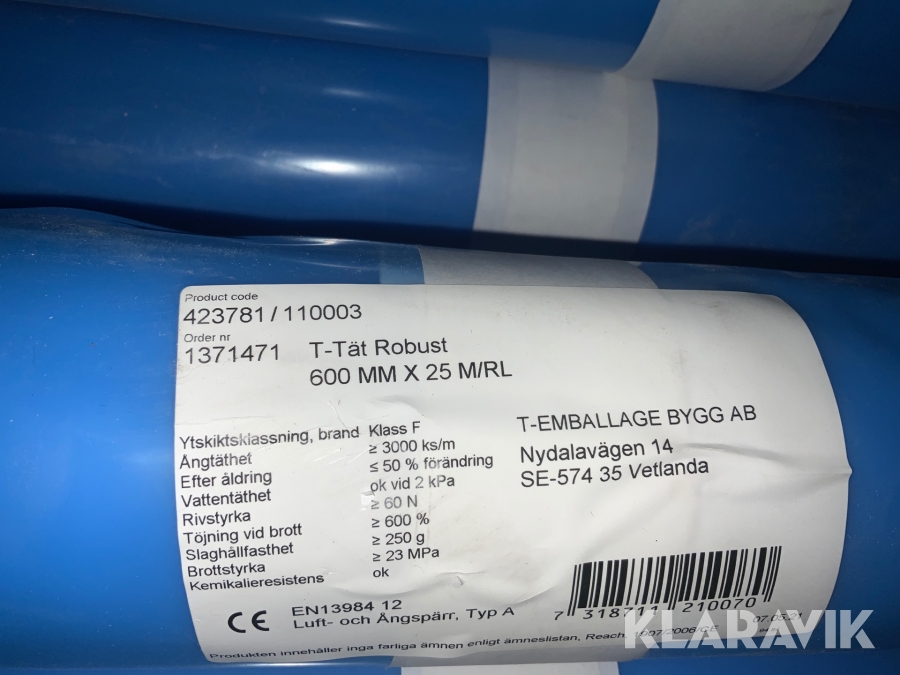 Byggfolie luft och ångspärr T emballage 600 mm x 25 meter. 59 rullar