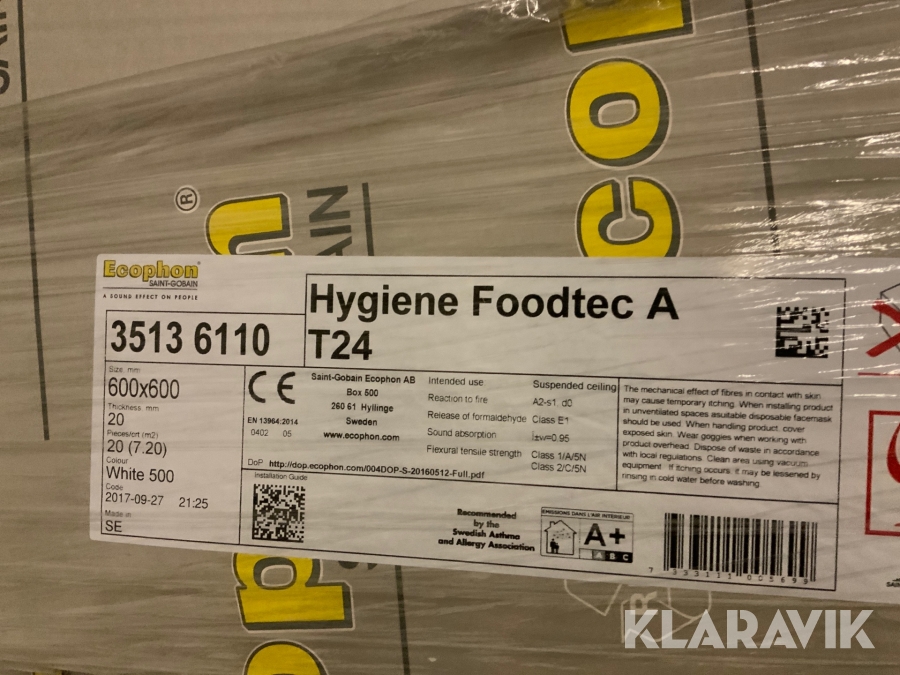 Ecophone Saint gobain Hygiene foodtec A T24/tech, 600x600 mm , ca 240 stycken white 500