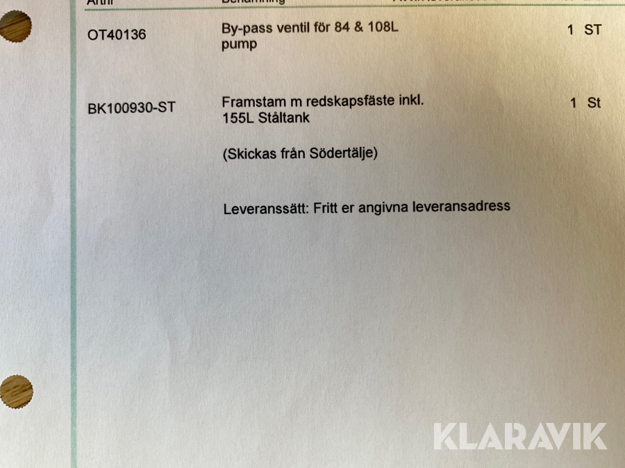 Boka frakt? Det finns ingen specifik information om frakt för just det här objektet, men om du skickar oss en förfrågan via vårt fraktformulär, så undersöker vi möjligheten. Paket, EU-pall eller större maskin? Klaravik har fraktavtal med Schenker och i de fall vi kan hjälpa till med frakt gäller det objekt som ryms i paket eller inom en EU-pall (upp till 120*80 cm och 990 kg). Det går att beställa frakt inom Sverige, dock inte till utlandet. Vid frakt på större maskiner rekommenderar vi gärna transportföretag som du kan kontakta.