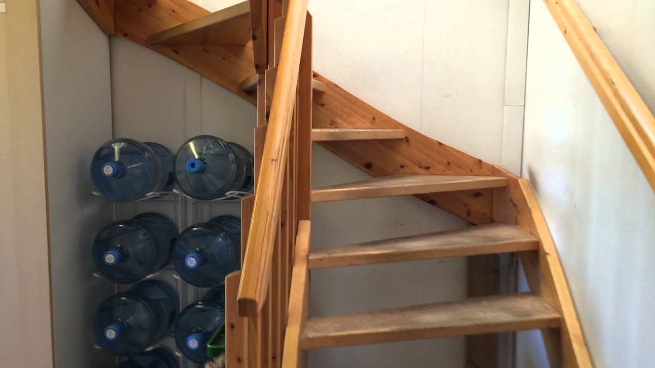 Furutrapp till övervåning med fönster i trappen.