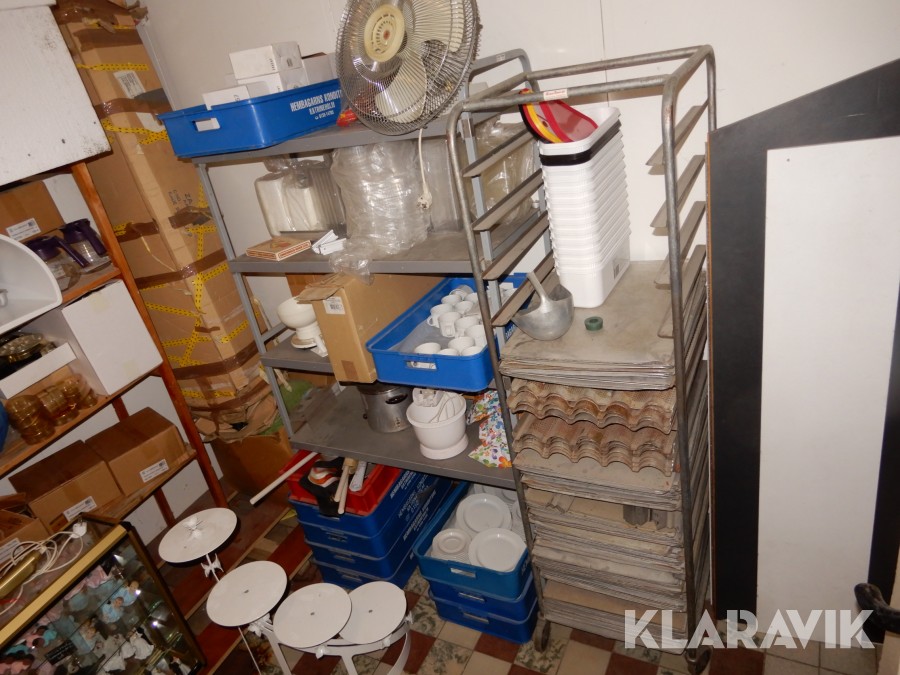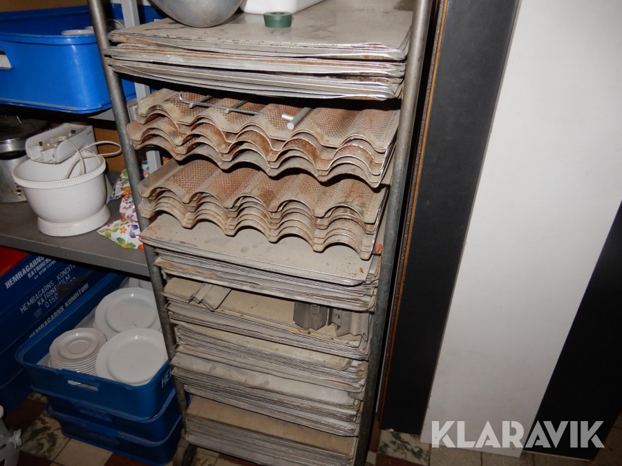 Vagn för bakplåtar samt stor mängd plåtar.