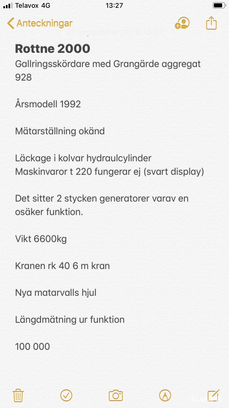 Du som köpare är skyldig att kontrollera objektet vid hämtning. Skiljer sig något avsevärt jämfört med informationen på klaravik.se? Kontakta då Klaravik innan du tar objektet från platsen. Läs fullständiga köpvillkor.