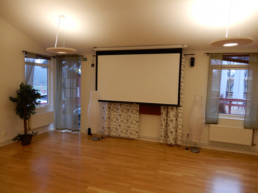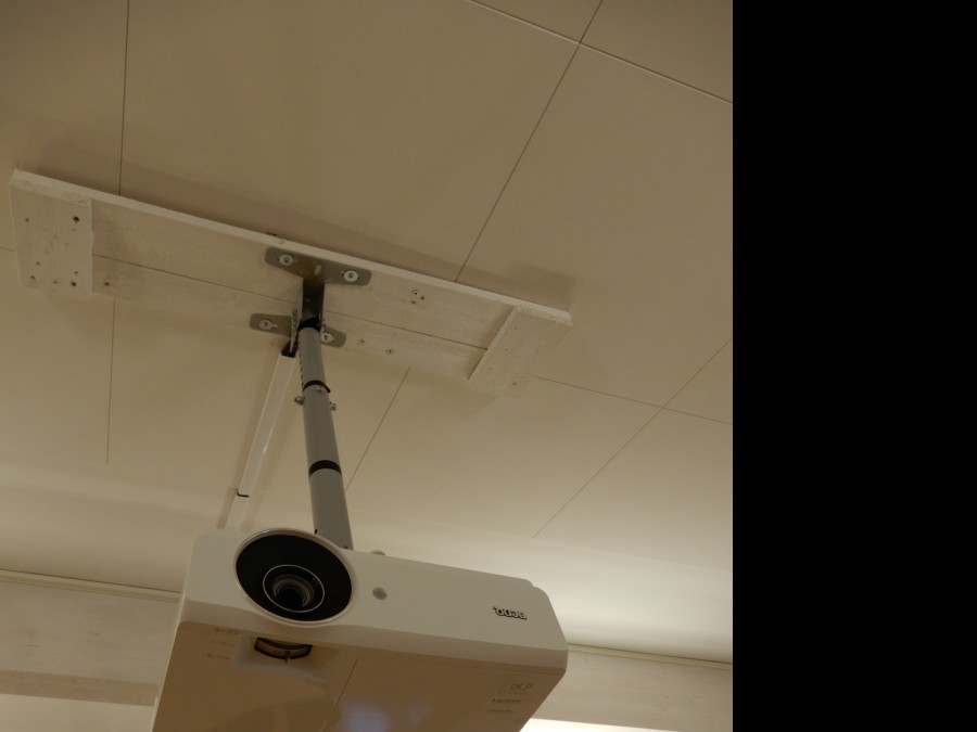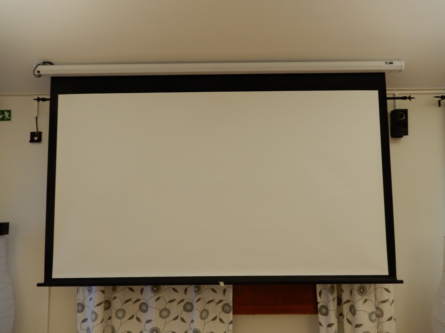 Stor projektorduk, elektriskt höj/sänkbar.