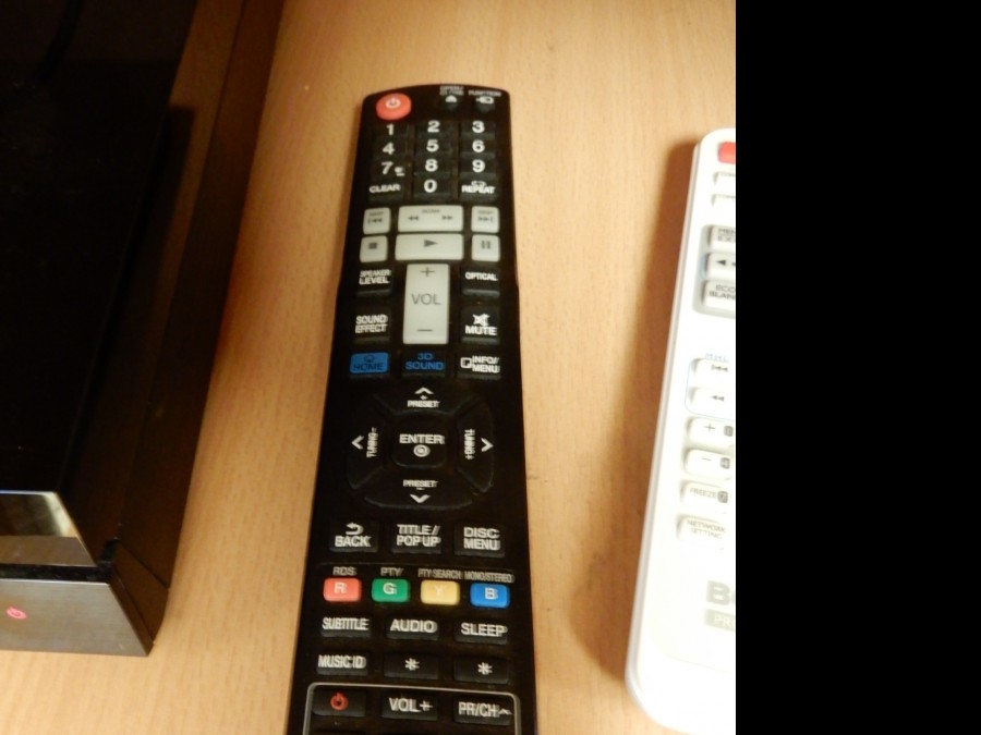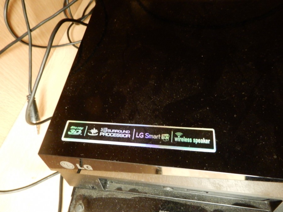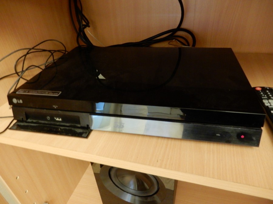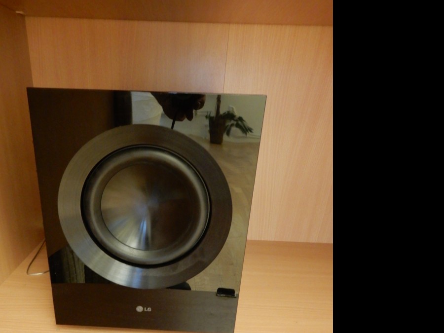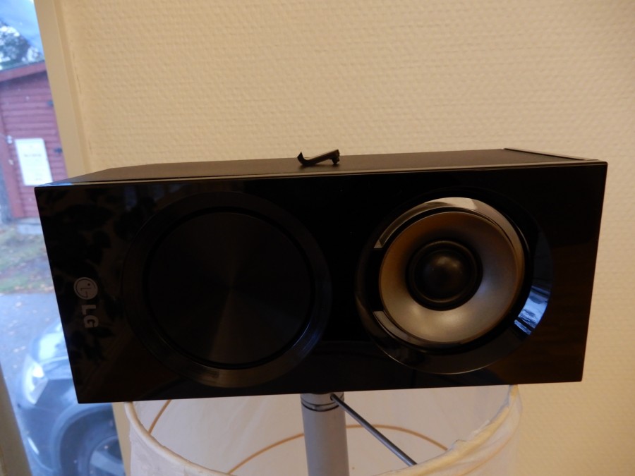 Högtalarsystem LG med 4 högtalare, subwofer samt Blu-rayspelare med fjärr.