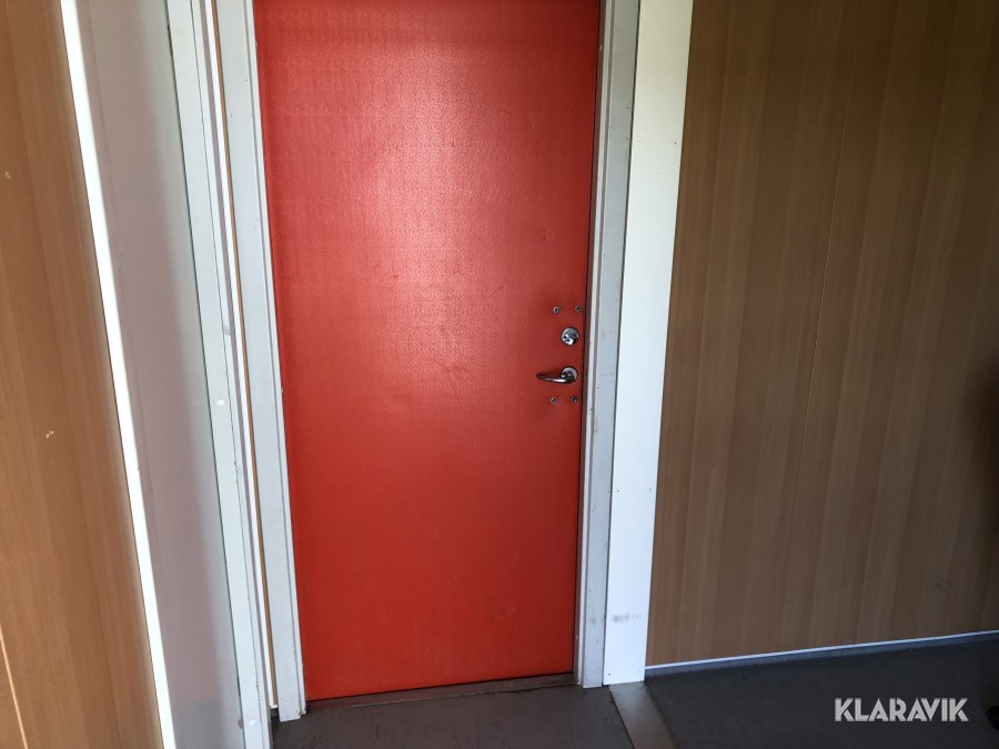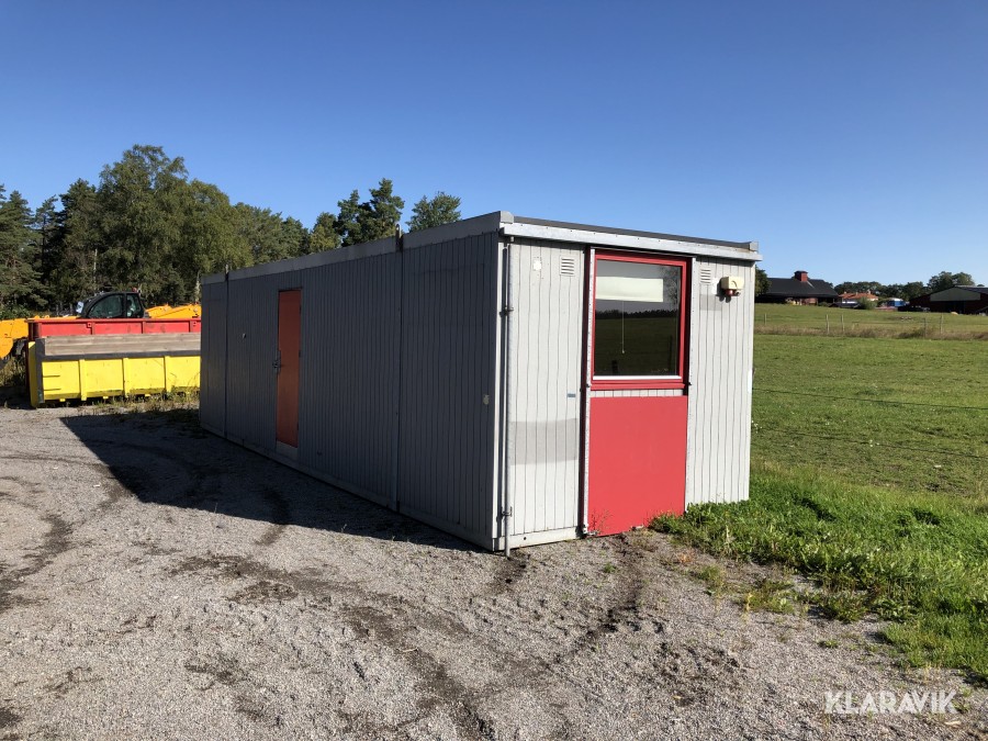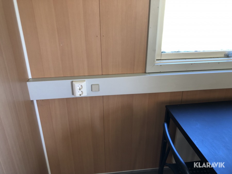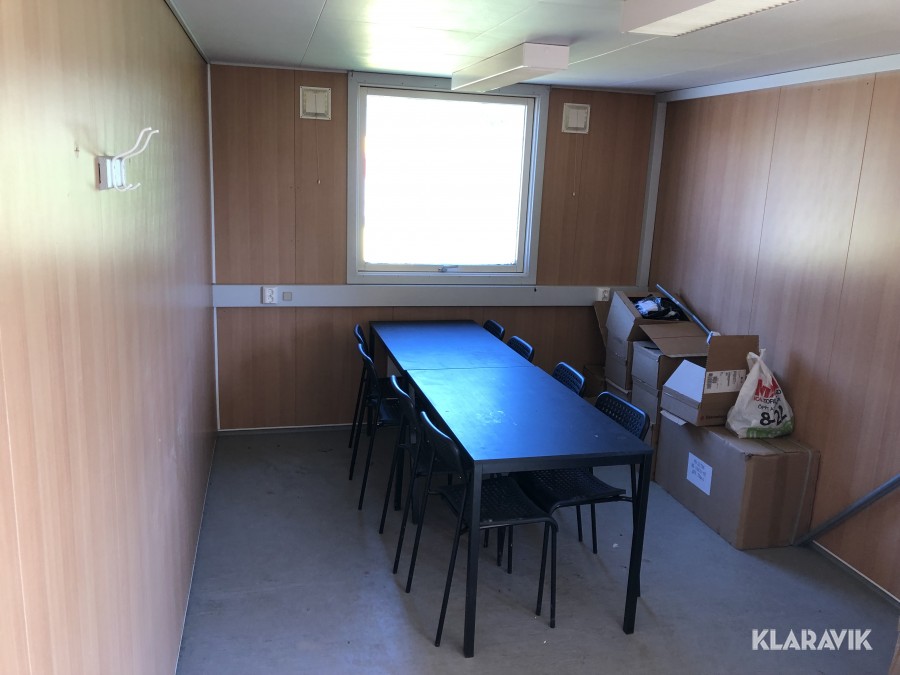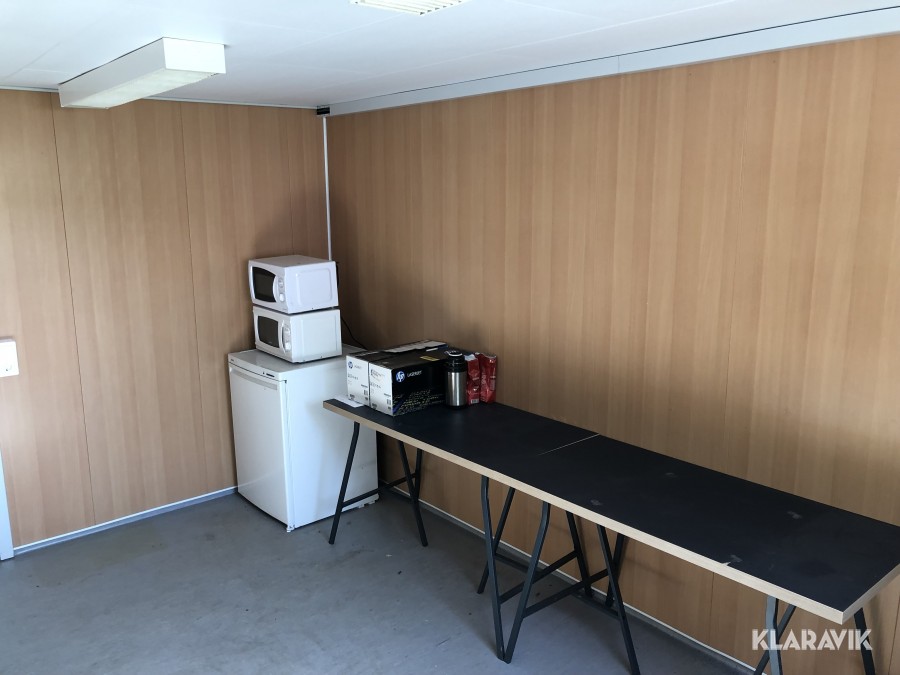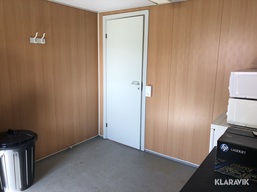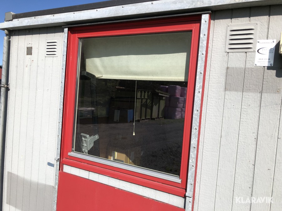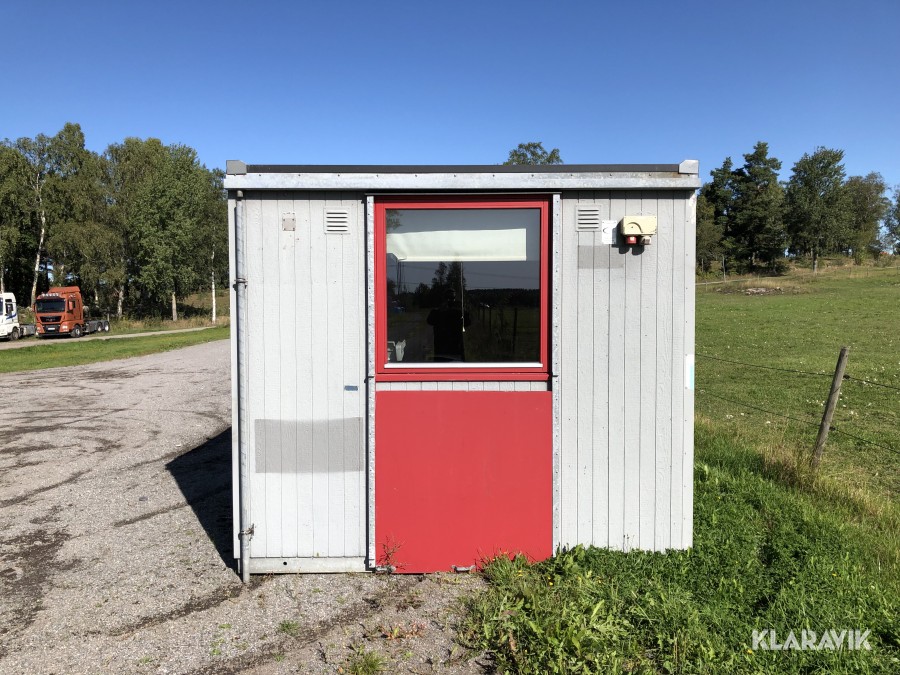 kontorsbod med korridor och två rum. Utrustad med fönsterluckor (går att demontera).kylskåp, bord och stolar, samt Fasadskivor.
