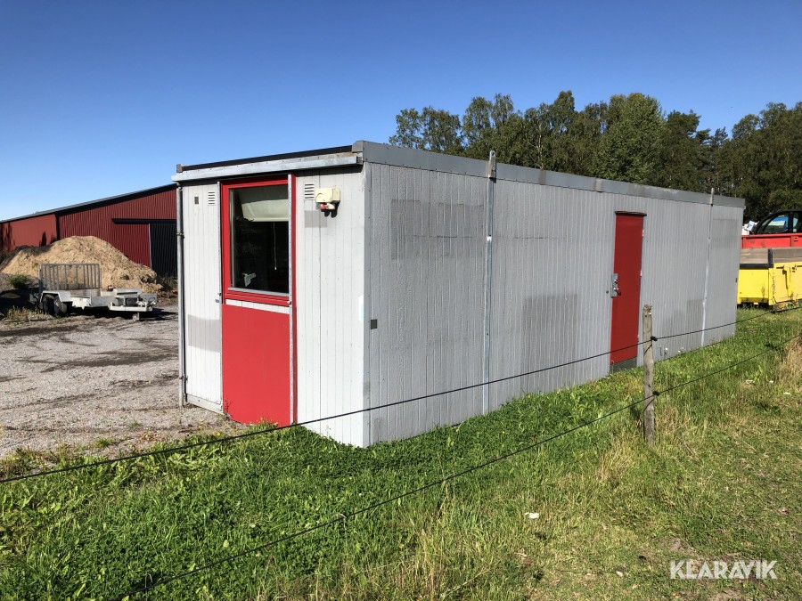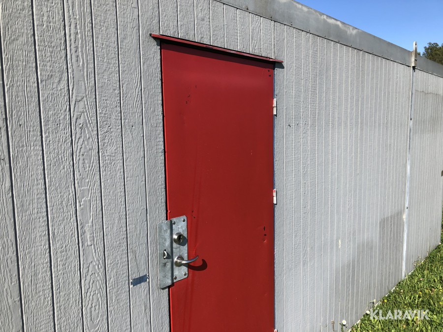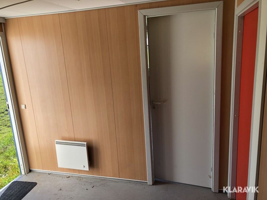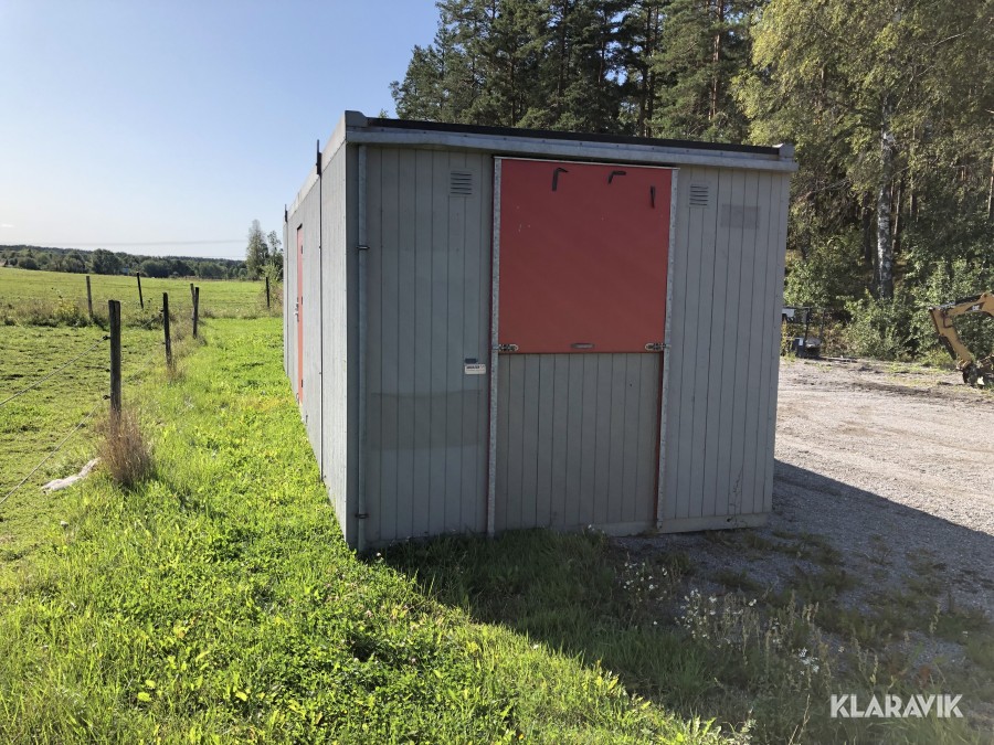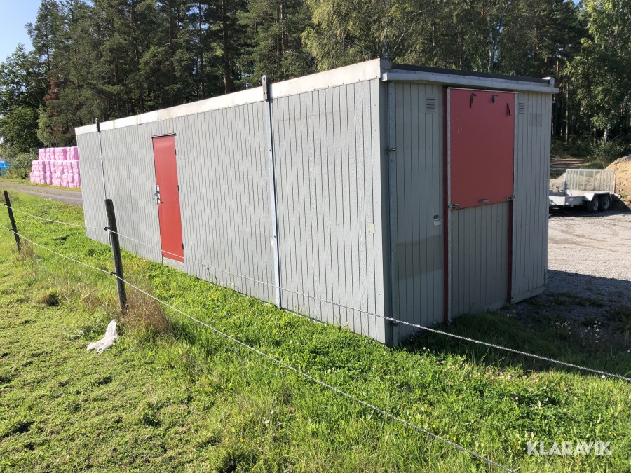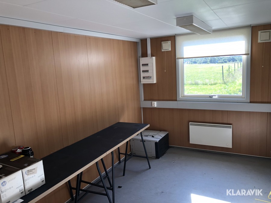 Komplett med elinstallationer, radiatorer under fönster samt armaturer tak, isolerad, byggd på stålram med lyftöglor.