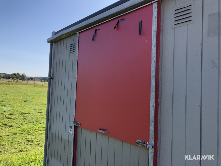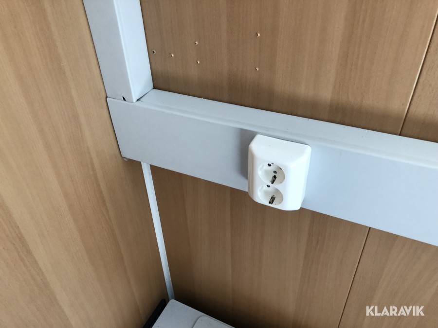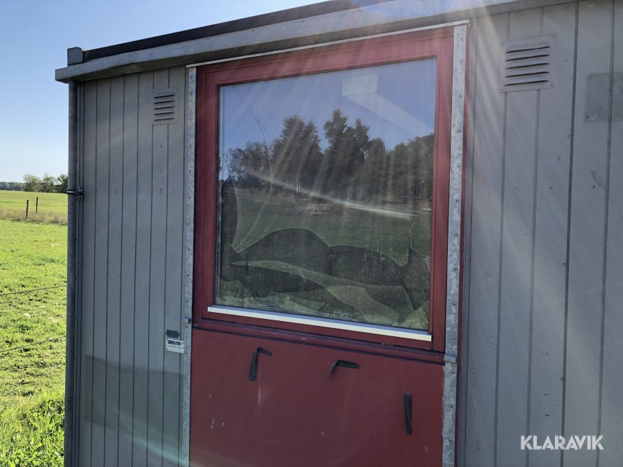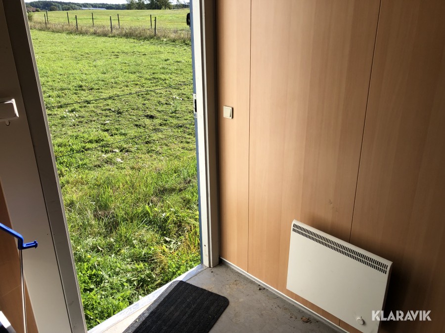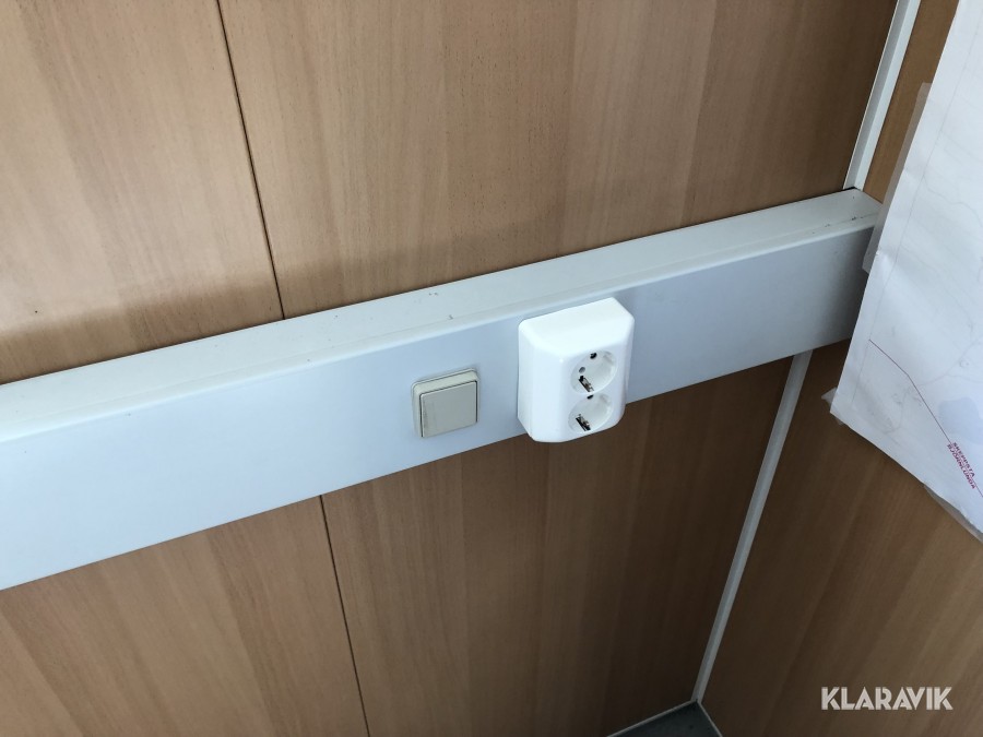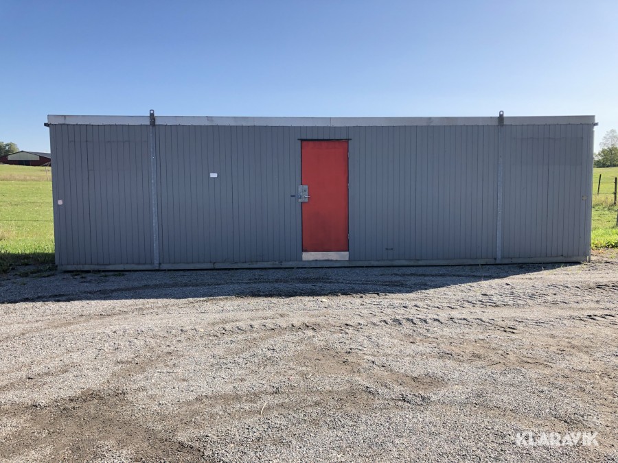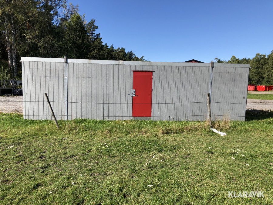 Komplett med elinstallationer, radiatorer under fönster samt armaturer tak, isolerad, byggd på stålram med lyftöglor.