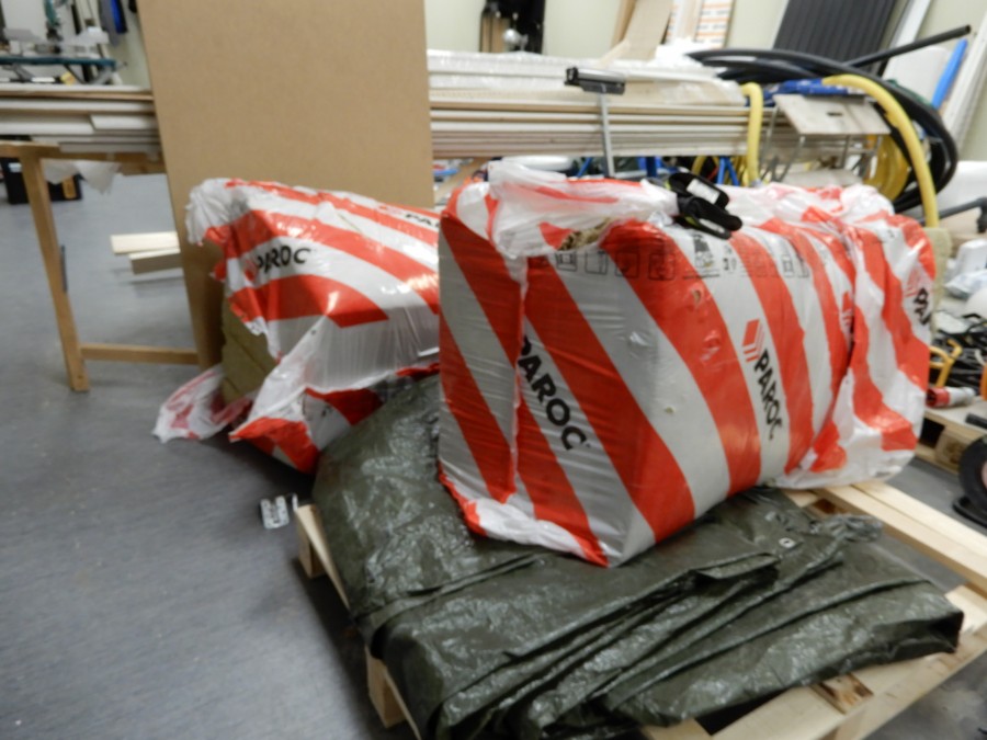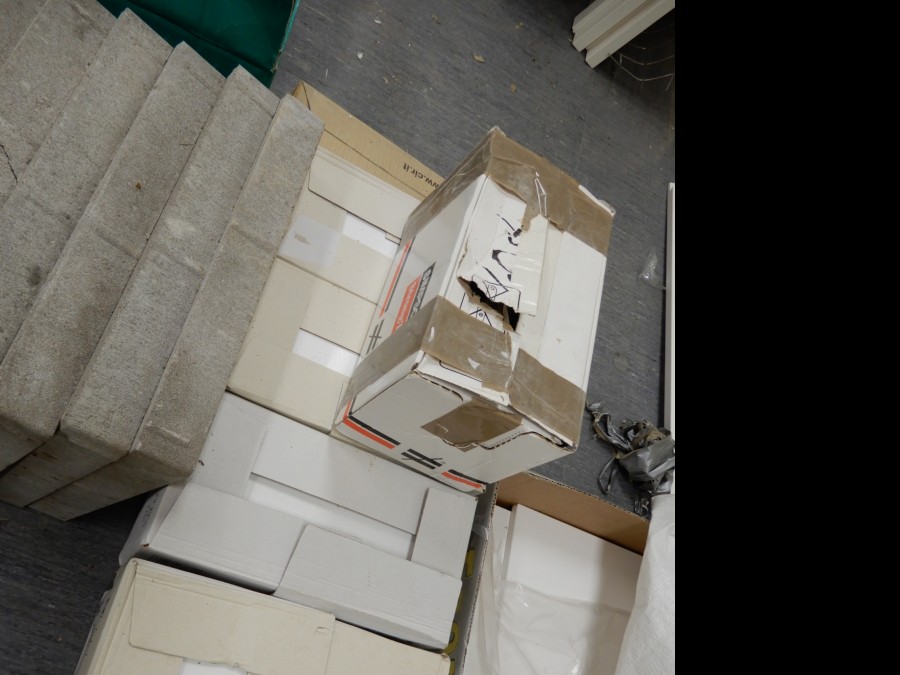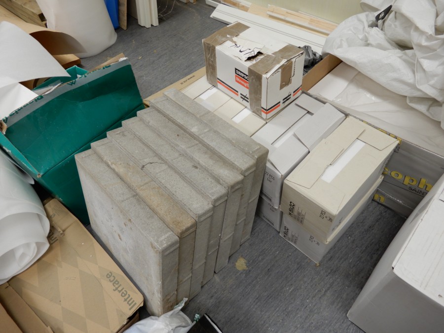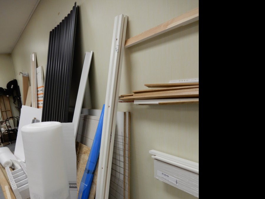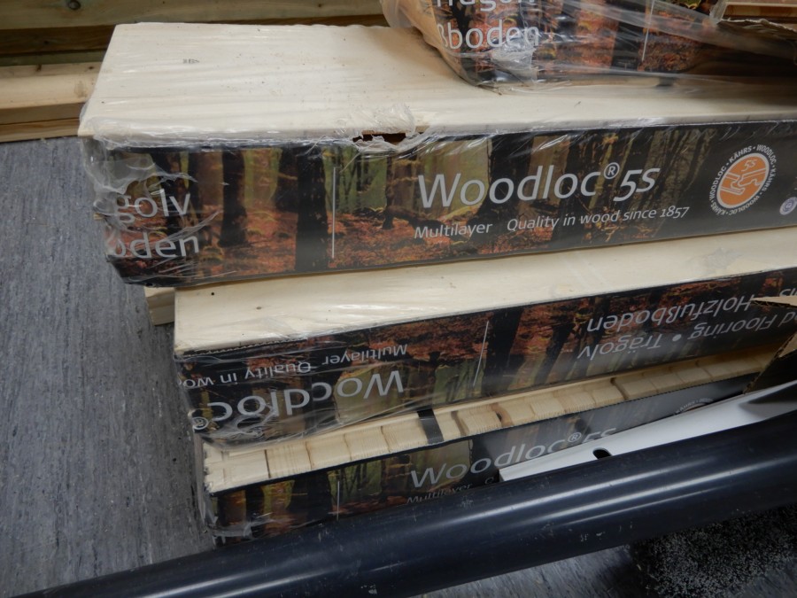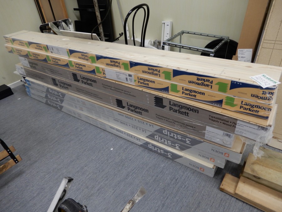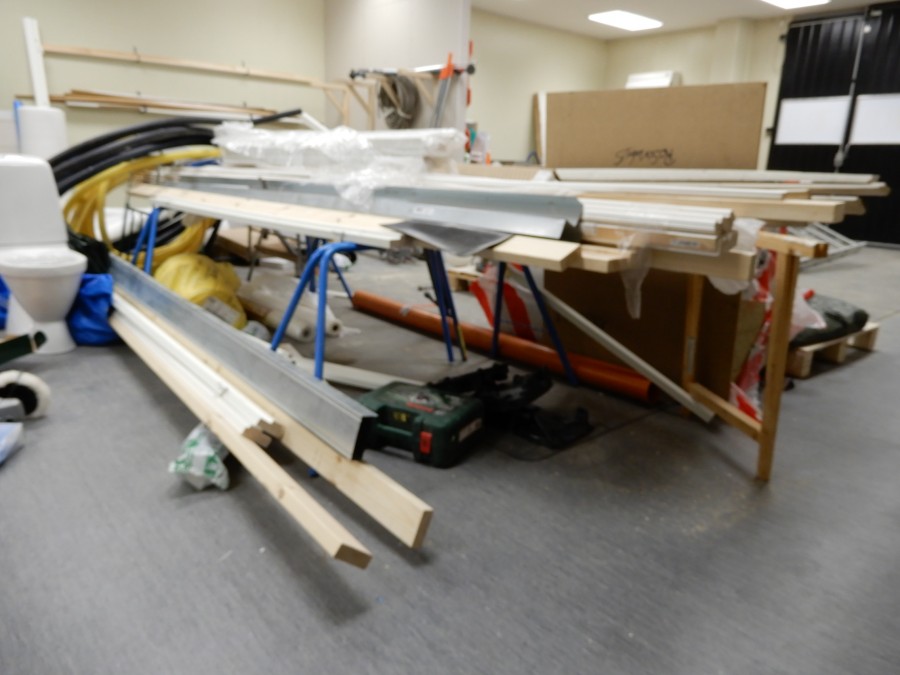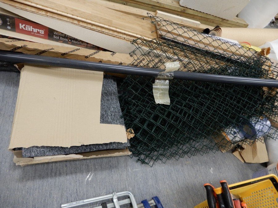 Mängder med byggmtrl. Parkettgolv, lister, plåt, golvmatta, staketnät, innerdörr (ny), toastol (ny), inspektionsluckor, klinkerplattor, avloppsrör m.m, 2 st trappstegar, 5 st arbetsbockar i metall, div.skivmaterial etc, m.m.