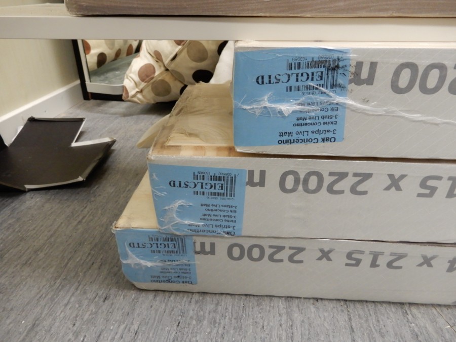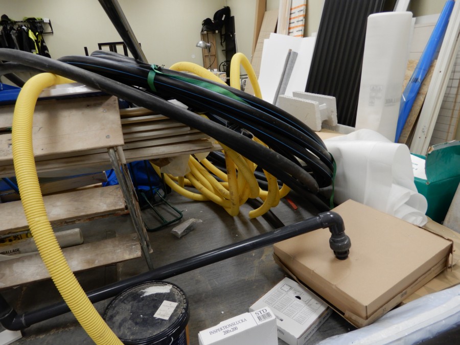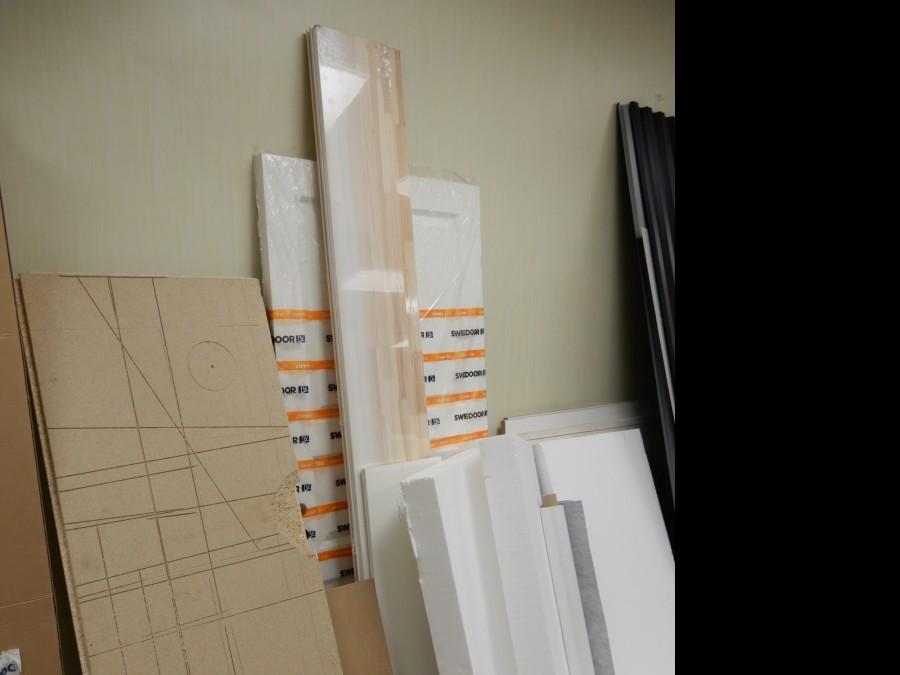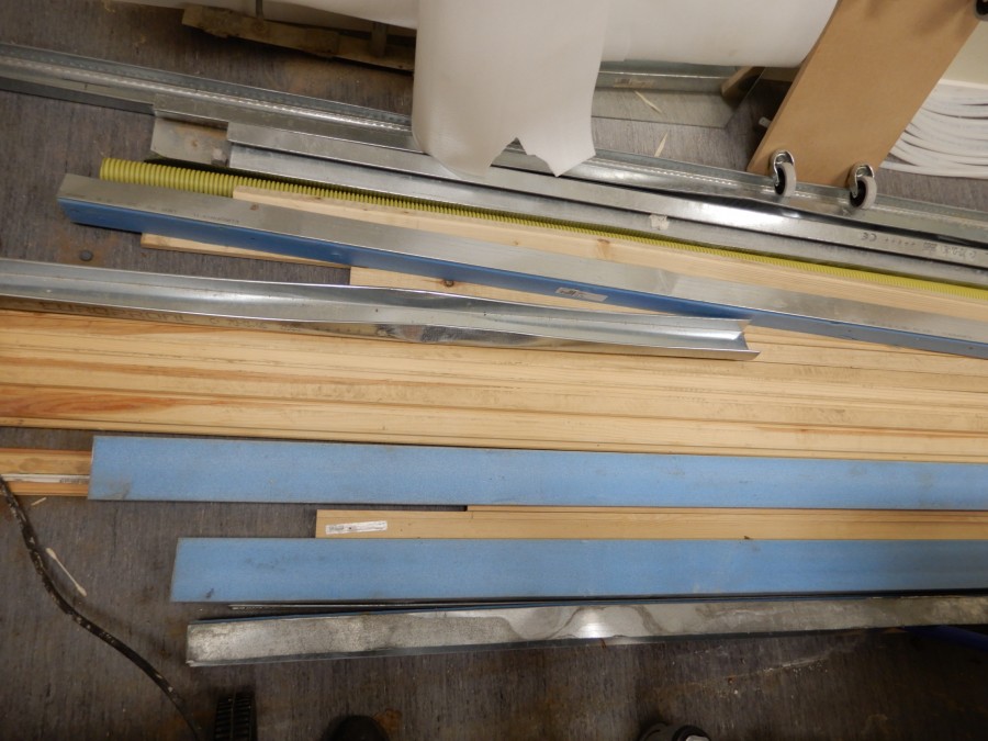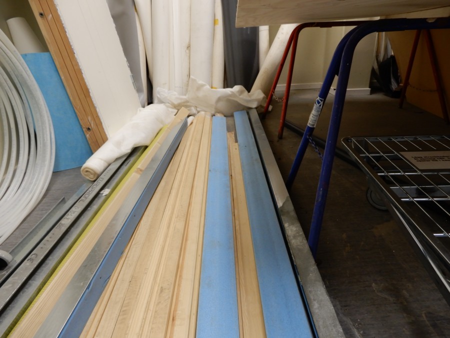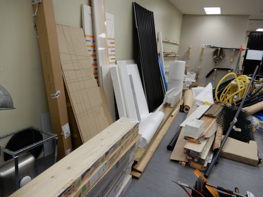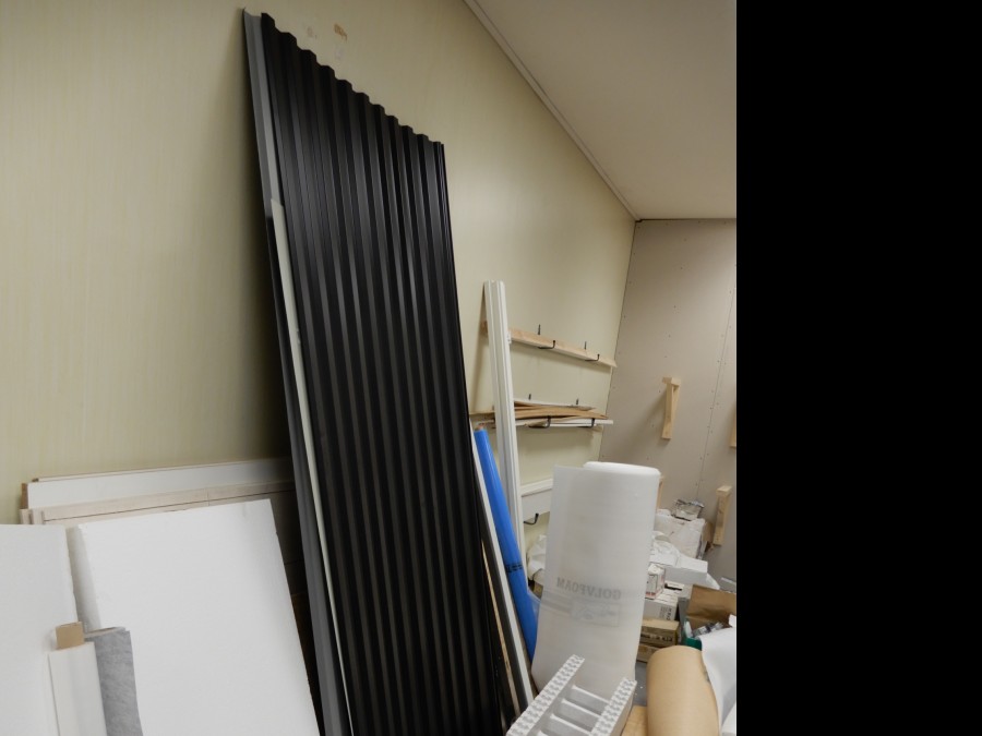 Mängder med byggmtrl. Parkettgolv, lister, plåt, golvmatta, staketnät, innerdörr (ny), toastol (ny), inspektionsluckor, klinkerplattor, avloppsrör m.m, 2 st trappstegar, 5 st arbetsbockar i metall, div.skivmaterial etc, m.m.