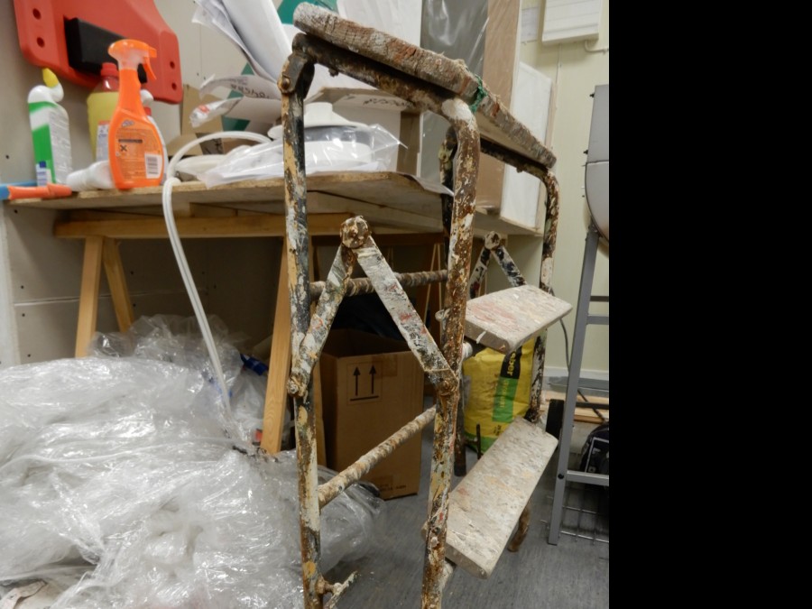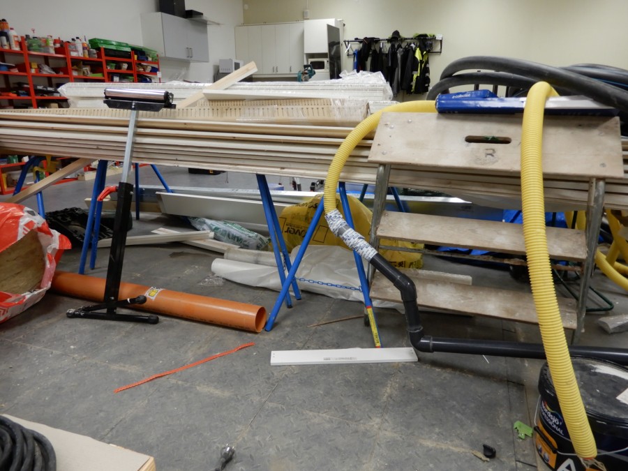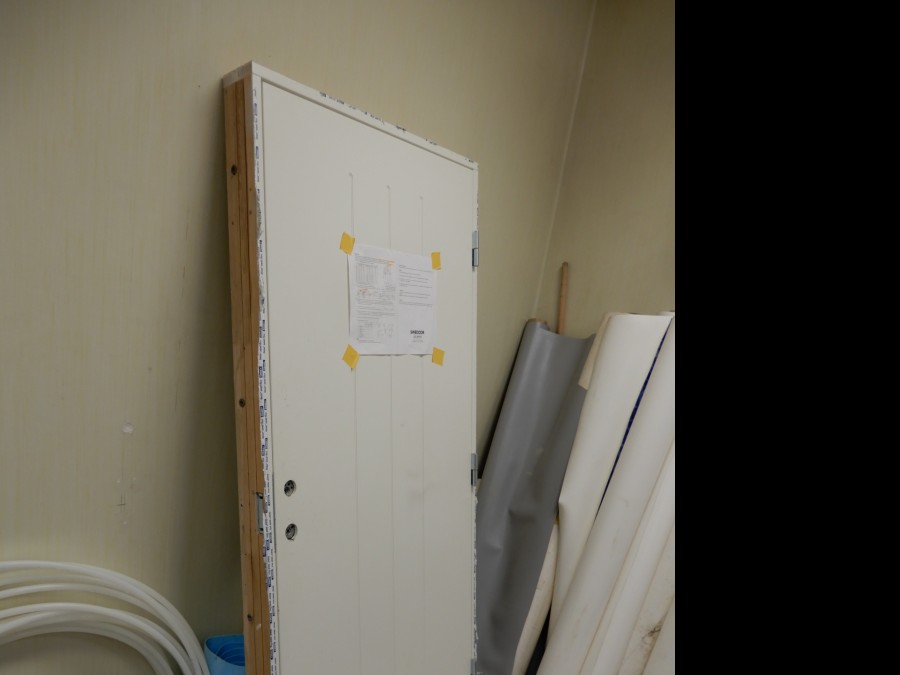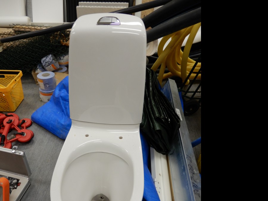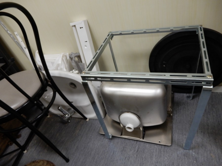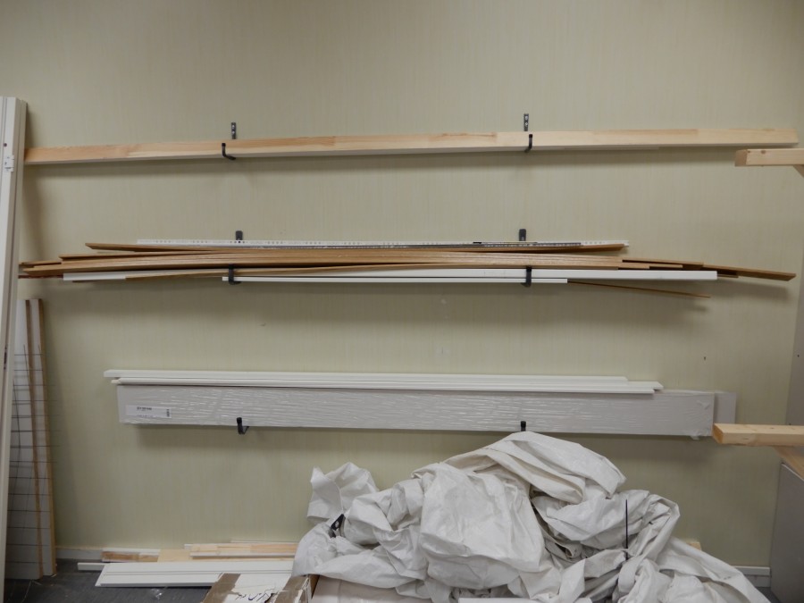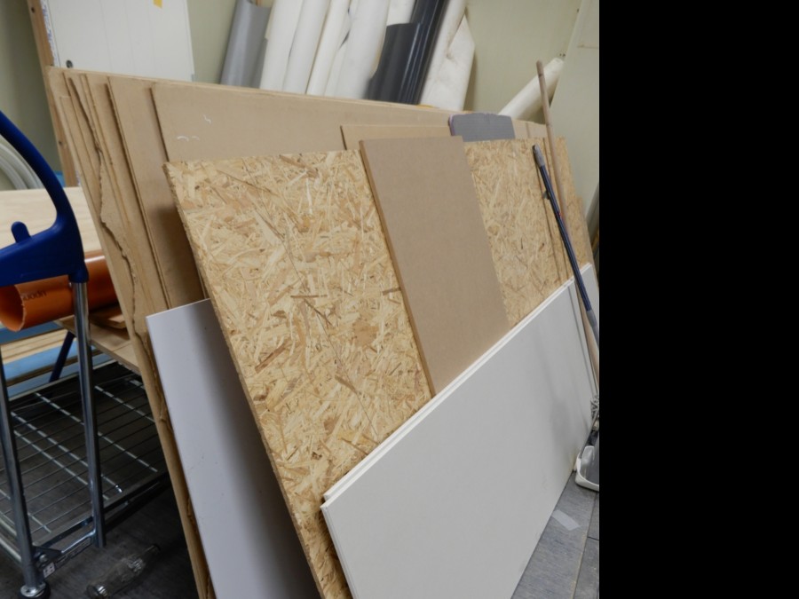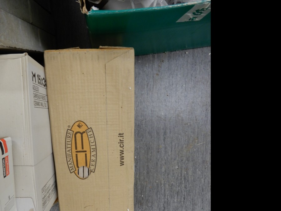 Mängder med byggmtrl. Parkettgolv, lister, plåt, golvmatta, staketnät, innerdörr (ny), toastol (ny), inspektionsluckor, klinkerplattor, avloppsrör m.m, 2 st trappstegar, 5 st arbetsbockar i metall, div.skivmaterial etc, m.m.