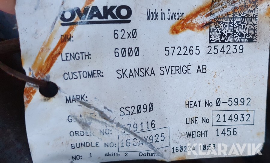 Rundstål 62mm. lagrat utomhus. 3.1 materialcertifikat finns.