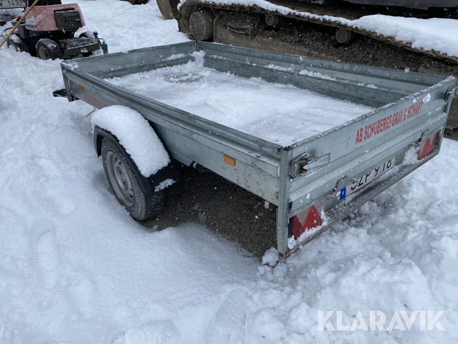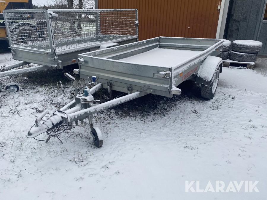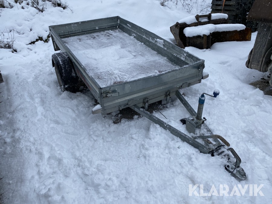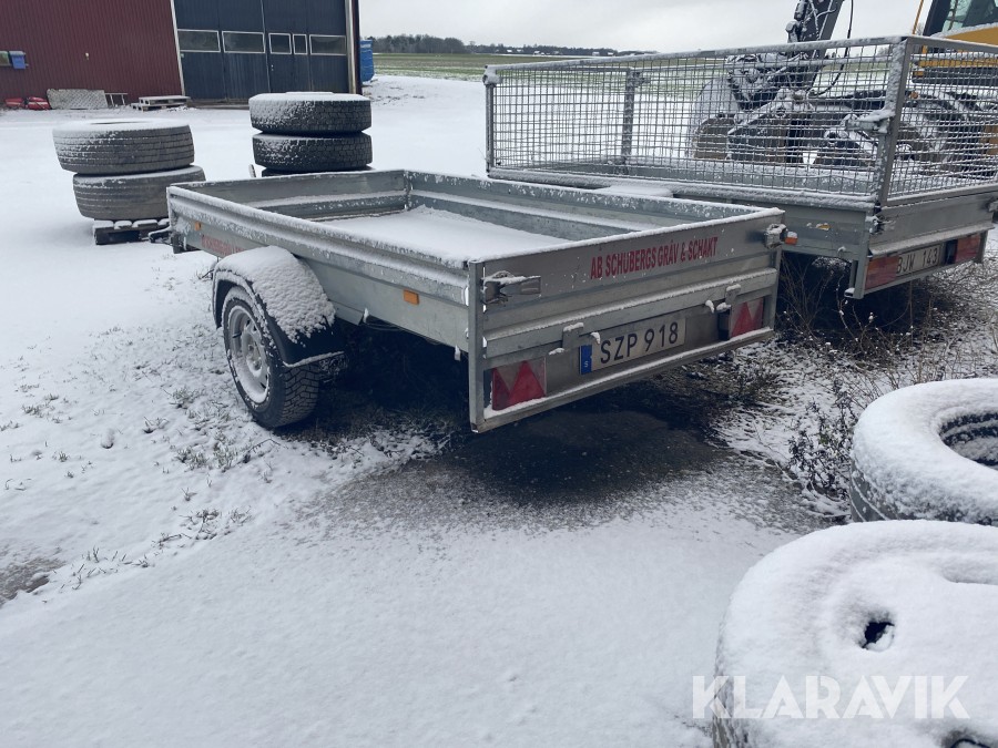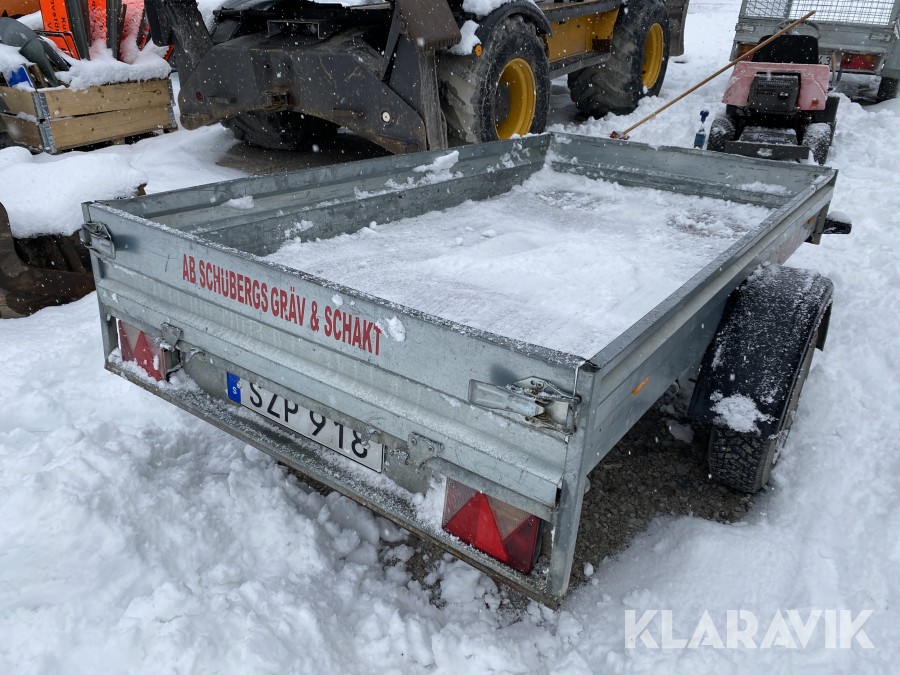 Bromsat personbilssläp i OK skick, några inbuktningar och mindre skador, se även bilder för detaljer.