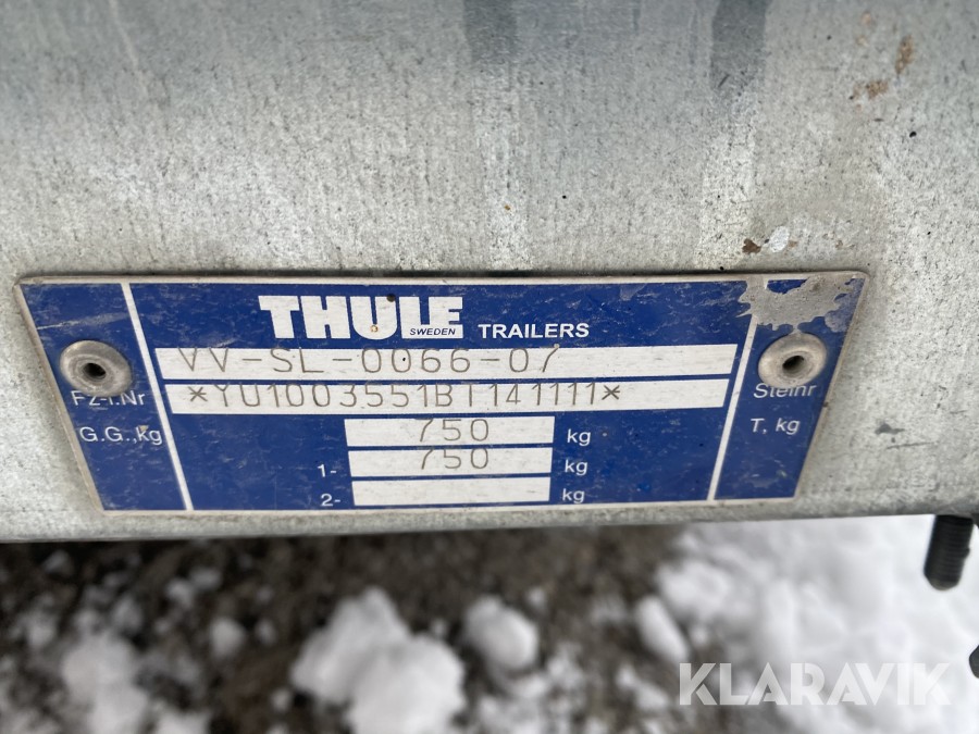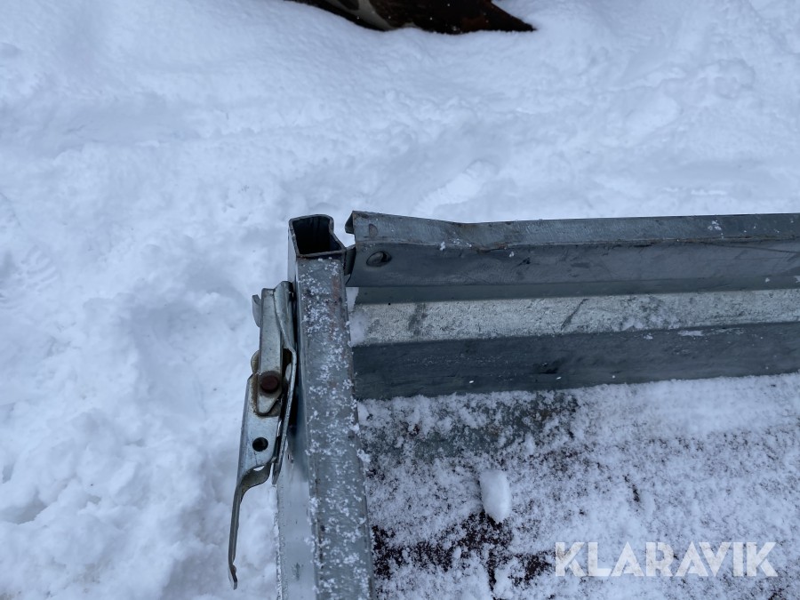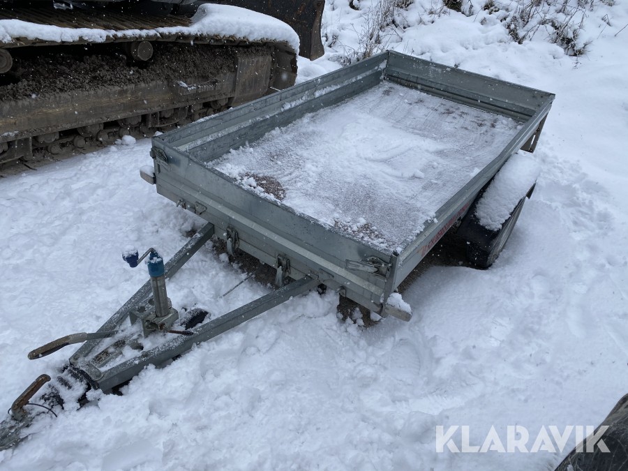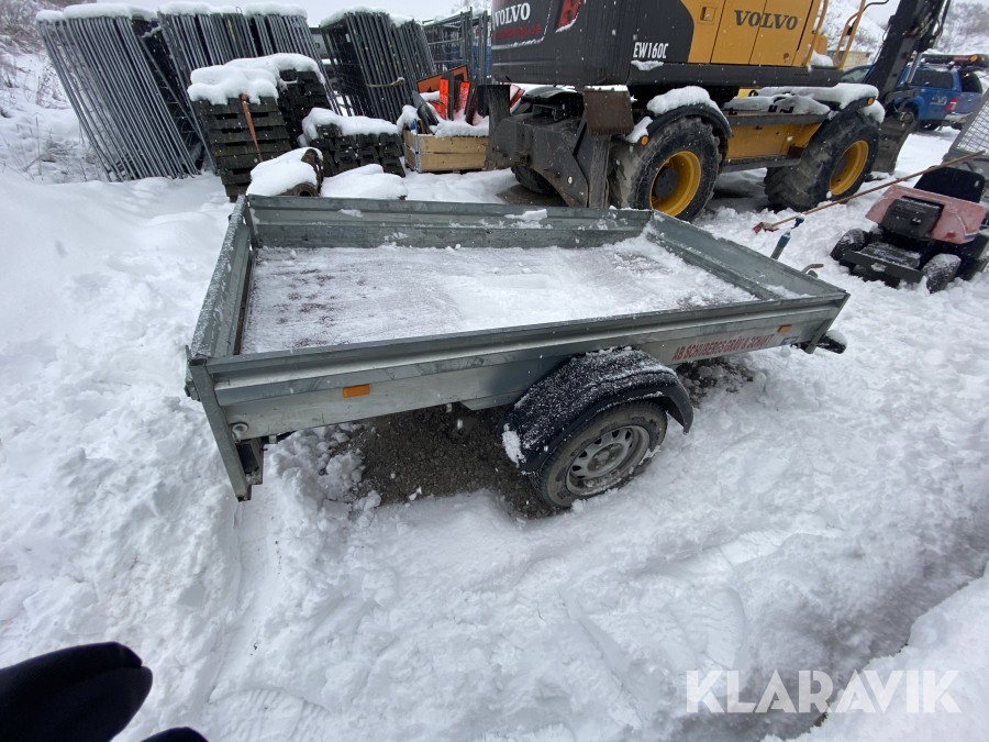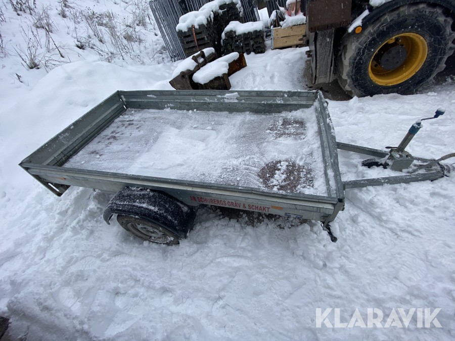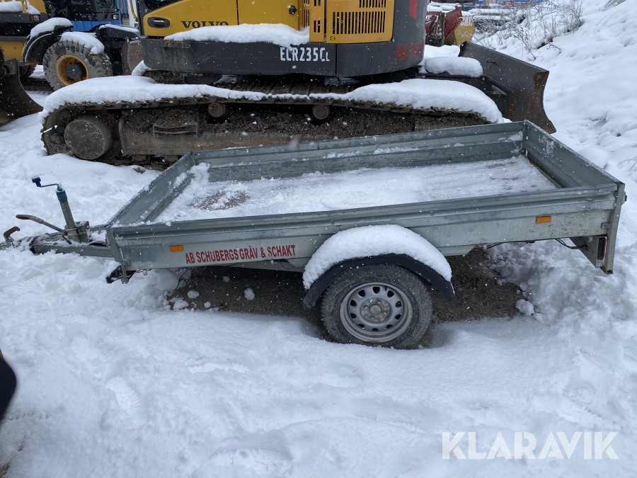 Bromsat personbilssläp i OK skick, några inbuktningar och mindre skador, se även bilder för detaljer.