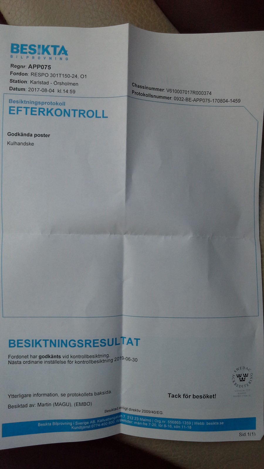 Nästa besiktning senast: 2019-06-30