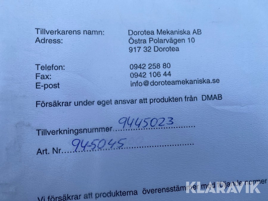 Boka frakt? Det finns ingen specifik information om frakt för just det här objektet, men om du skickar oss en förfrågan via vårt fraktformulär, så undersöker vi möjligheten. Paket, EU-pall eller större maskin? Klaravik har fraktavtal med Schenker och i de fall vi kan hjälpa till med frakt gäller det objekt som ryms i paket eller inom en EU-pall (upp till 120*80 cm och 990 kg). Det går att beställa frakt inom Sverige, dock inte till utlandet. Vid frakt på större maskiner rekommenderar vi gärna transportföretag som du kan kontakta.